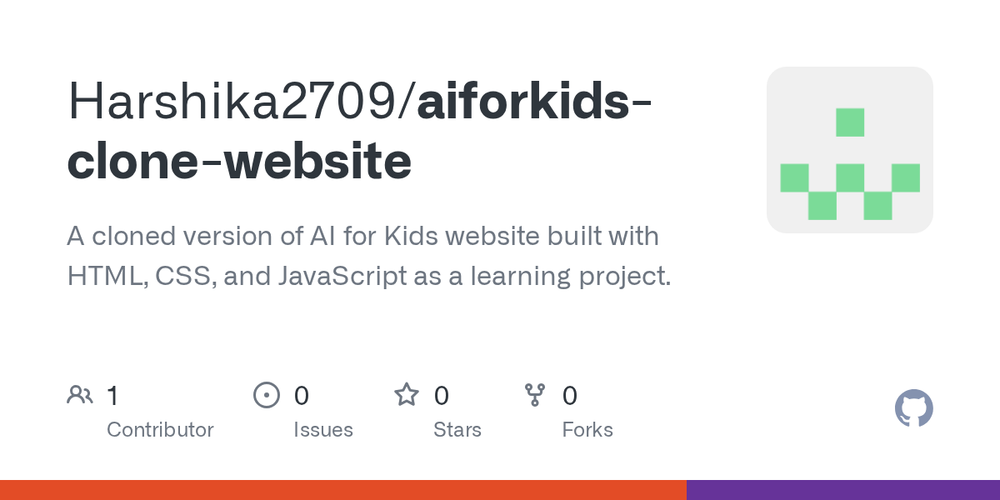 The AI for Kids Clone Website is a project created by Harshika2709 that serves as a learning tool for web development. This cloned version of the AI for Kids website is built using HTML, CSS, and JavaScript, showcasing the ability to replicate a functional and interactive web application.