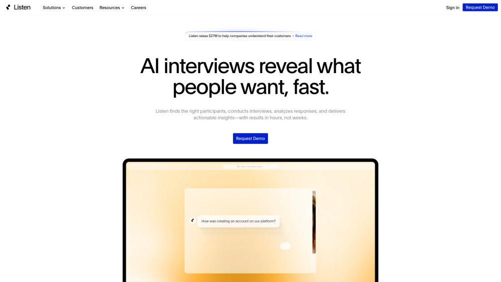 Listen Labs is an AI-first research platform that conducts customer interviews and summarizes responses into insightful and actionable reports. It replaces traditional manual research methods with AI-moderated interviews, allowing businesses to gain valuable insights quickly and efficiently.