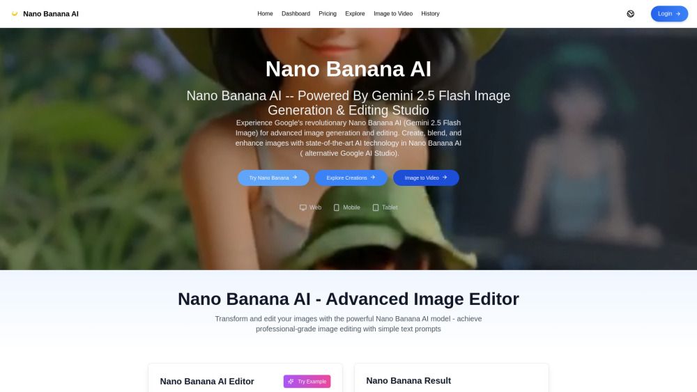 Nano Banana AI is an advanced AI studio powered by Google's Gemini 2.5 Flash Image technology, designed for revolutionary image generation and editing. It allows users to create, blend, enhance, and transform images with state-of-the-art AI, achieving professional-grade results through simple text prompts. The platform also offers image-to-video conversion and boasts features like one-shot perfect generation, lightning-fast processing, face completion technology, and consistent character editing.