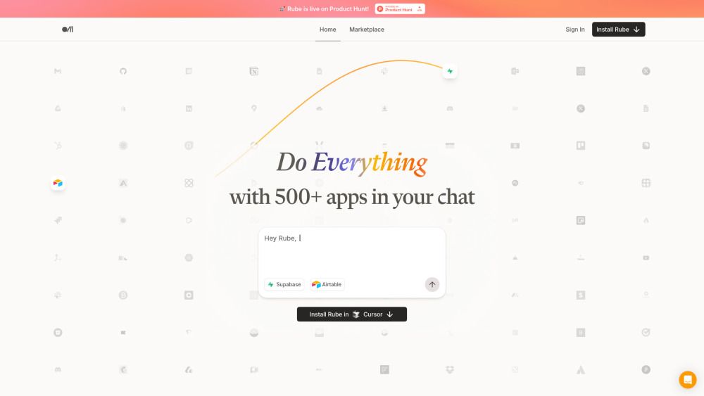 Rube is a universal Multi-Client Platform (MCP) developed by Composio that enables users to take actions across 600+ applications directly from within their AI chat interfaces, such as Cursor, Claude, or VS Code. It seamlessly and securely manages authentication and tool selection within the chat environment, allowing AI to interact with a wide range of apps without additional setup.