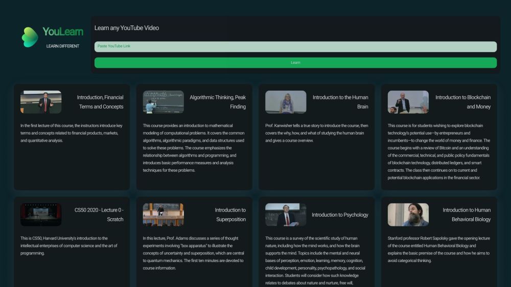 YouLearn is an AI-driven learning platform that provides tailored educational experiences, reshaping how students and teachers interact with learning material. It allows users to learn from an AI tutor that understands PDFs, YouTube videos, and recorded lectures.